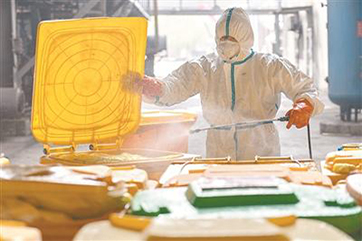 新冠肺炎疫情發生后,每天產生的巨量醫療廢物成為武漢市亟待解決的重要問題。圖為近日,在武漢市青山區云峰公司,工作人員在對醫療廢物轉運箱消毒。新華社記者 才揚 攝3月11日,記者從國務院聯防聯控機制新聞發